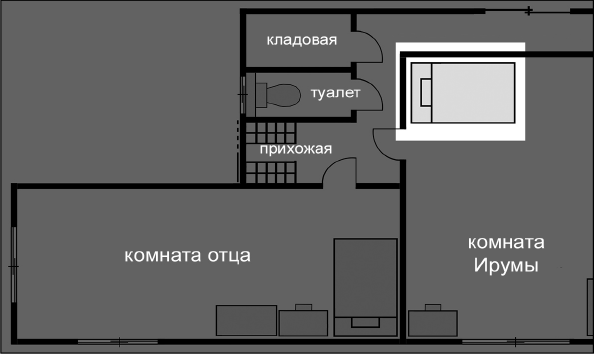Курихара: В обоих случаях говорится о комнате рядом с той, где они ужинали, но, судя по описанию, это не может быть одна и та же комната. Следовательно, надо полагать, что это две разные комнаты. Тогда определим их расположение относительно друг друга.