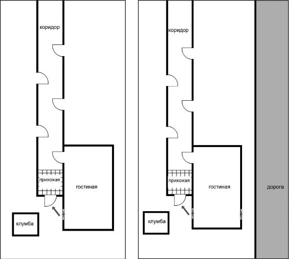 Курихара: Слева от крыльца клумба. По центру дома проходит длинный коридор. В нем много дверей.
