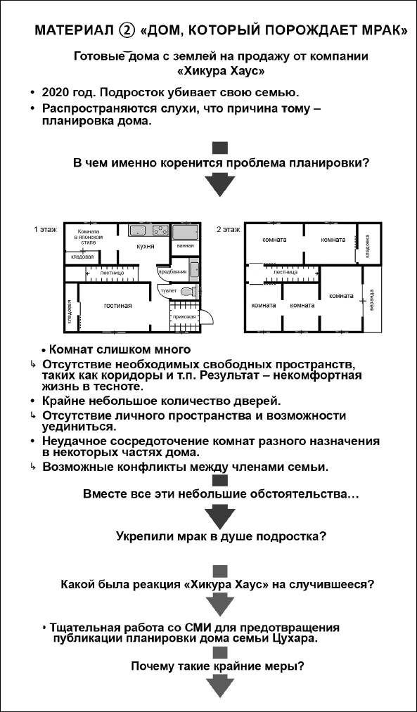 Курихара: Сотрудник компании насмерть сбивает ребенка рядом с участком клиента. Это ужасное происшествие. Возможно, именно из-за него доверие к «Хаусмэйкер Мисаки» резко снизилось. В Тюбу «Мисаки» – главный конкурент «Хикуры Хаус».