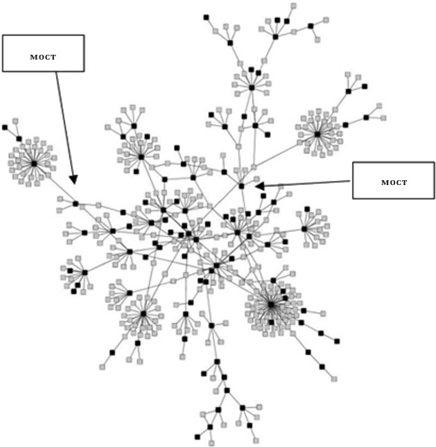 Мегасеть связей 435 взаимосвязанных сексуальных партнеров за один год. Сан-Франциско, 2013. Черными квадратами обозначены носители сифилиса либо сифилиса в комбинации с ВИЧ. Серые квадраты обозначают сексуальные контакты с незараженными (или непроверенными) людьми. На основе исследования Р. Кона и с его разрешения18.