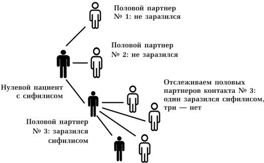 Отслеживание контактов: нулевой пациент с сифилисом называет имена трех человек, с которыми занимался сексом за последние три месяца. Специалисты по интервенции заболеваний (СИЗ) находят эти контакты и проверяют их на сифилис. Найден зараженный партнер, у него узнают имена его половых партнеров. Процесс продолжается до тех пор, пока не останется ни одного не проверенного на сифилис контакта (пациент или контакт отказываются от проверки, все контакты получают отрицательный результат анализов или не получается контакты найти).
