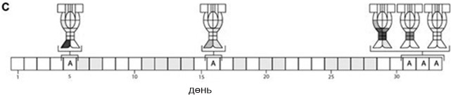 Тепловая карта женских наружных половых органов и промежности с указанием расположения, частоты и интенсивности вирусовыделения на примере одной пациентки в течение 30 дней. Буквой А обозначены дни скрытого (бессимптомного) выделения вируса. Из статьи Джонсон и соавт., Journal of Virology, 2014.