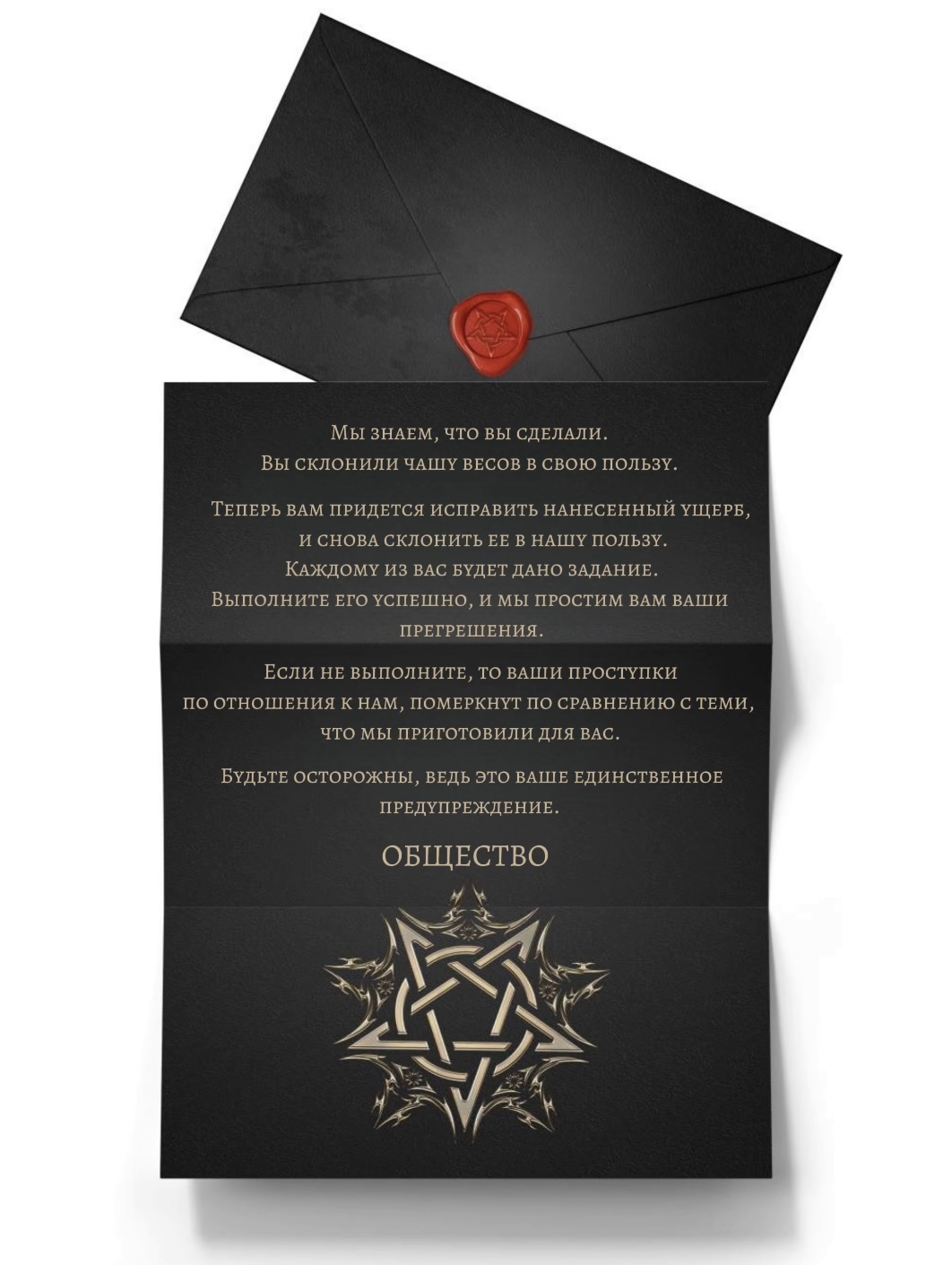 Когда спустя несколько часов я, наконец, возвращаюсь домой и вижу на столе черный конверт с моим именем, понимаю, что Обществу так же, как и мне, не терпится начать это шоу. И мне повезло, что я первый, на кого они решили обратить внимание.