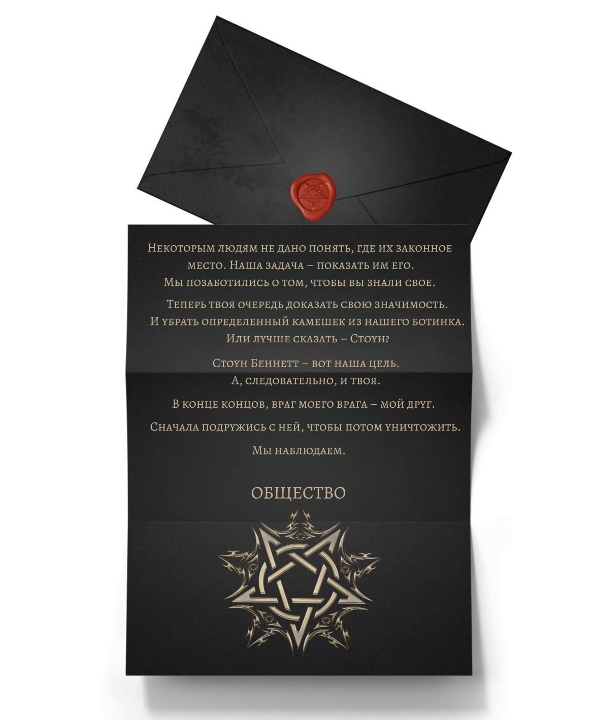 – Что это за хрень? – спрашивает Истон, смело беря его в руки, в то время как я пытаюсь отодвинуться от проклятой штуковины как можно дальше, чуть не падая с кровати. Пока Ист разглядывает конверт с обеих сторон, первое, что я замечаю, – это необычная красная печать, прикрепленная к черной бумаге. Я не могу точно разобрать рисунок, но, если бы мне пришлось угадывать, то я бы сказал, что это похоже на какую-то сложную пентаграмму. Еще одна вещь, которая сразу же привлекает мое внимание, – это то, что печать уже сломана, намекая на то, что Линкольн уже знает о содержимом конверта.