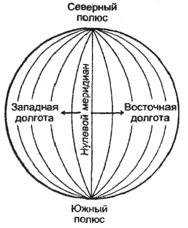Меридианы измеряют восточно-западное расположение точек на поверхности Земли, Восточно-западное расположение называют долготой, так как меридианы» которые тянутся с севера на юг, пересекают карты вдоль. (На картах обычно север изображают сверху, а юг – внизу.)