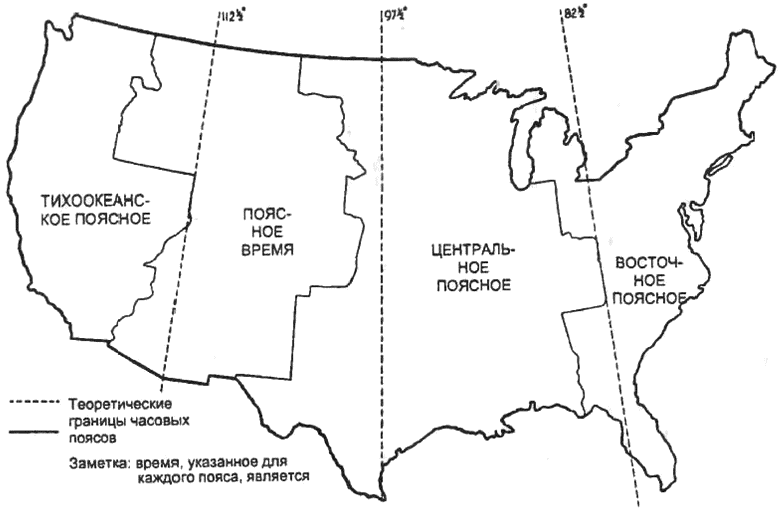 Если посмотрите на карту Соединенных Штатов, где отмечены часовые пояса, вас, вероятно, удивят изгибы и зигзаги пограничных линий. Теоретически зоны разграничены прямыми северо-южными линиями, но это может вызывать неудобство.