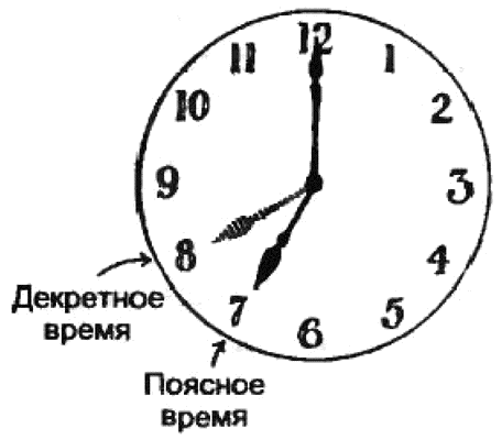 Это передвинутое на час вперед время называют стандартным летним временем или декретным летним временем.