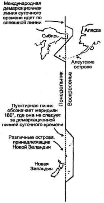 Палец, движущийся но земному шару на запад, каждый раз при пересечении часового пояса теряет 1 час. На линии 180º ему придется прибавить день, чтобы возместить эти часы. Мгновенное прибавление дня возмещает постепенную потерю 24 часов. Все это очень хорошо для путешествующих по глобусу пальцев. Но реальному человеку, путешествующему вокруг Земли, приходится сталкиваться с фактом вращения Земли и изменения времени. Это создает в пути определенное неудобство, когда день, потерянный или прибавленный у 180º, уравнивает часы, которые путешественник опередил или терял на часовых границах. Если бы в ходе путешествия он тщательно проверял и подсчитывал часы, потерянные или прибавленные на часовых границах, то, возвратившись в первоначальную точку, он обнаружил бы, что они уравнялись. Он не прибавил бы или не потерял бы ни единой секунды.