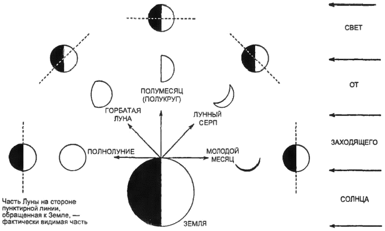 Но Луна не остается полной. На следующий день после захода Солнца она поднимается уже чуть приплюснутая с западного края. Спустя неделю после полной Луны она снова становится полукругом, но теперь круглым с восточной стороны и плоским с западной.
