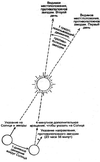 Движение Земли вокруг Солнца во время суточного вращения никак не повлияло бы на ее положение относительно звезды, которая находится очень далеко. Но Солнце, находящееся значительно ближе, в результате движения Земли уходило бы чуть назад, в отличие от звезды, (Возможно, вы наблюдали нечто подобное из окна движущегося поезда. Дом на горизонте «путешествует» вместе с вами. А дом недалеко от поезда кажется движущимся назад.)