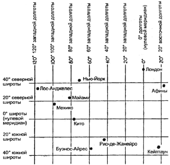 С помощью долготы и широты можно точно определить любую точку на поверхности Земли. Долгота указывает восточно-западное расположение, а широта – северо-южное. Таким образом, Нью-Йорк находится на 74º западной долготы и 40º северной широты; Лос-Анджелес – на 118º западной долготы и 34º северной широты; Лондон – на 0º долготы (ни на востоке, ни на западе, так как он находится на нулевом меридиане) и 51º30' северной широты.