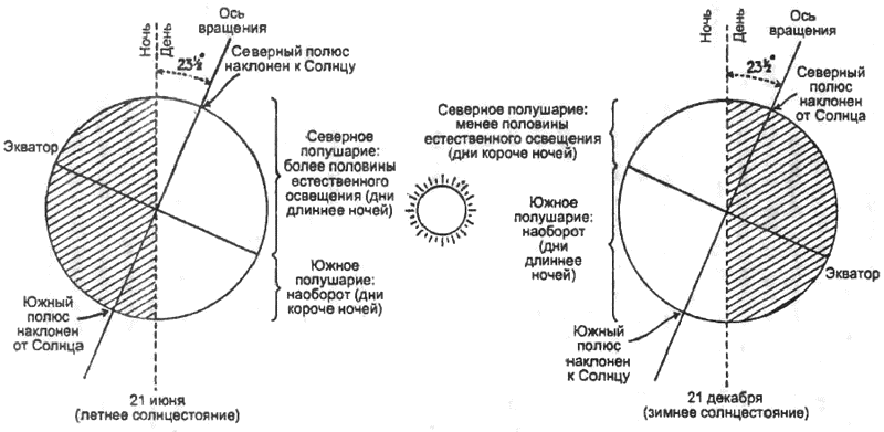 Наклон оси такой, что 21 июня Северный полюс находится максимально далеко от Солнца. В полдень нью-йоркское Солнце находится в небе довольно высоко – 161/2º от зенита. Так как широта Нью-Йорка – 40º севернее экватора, то полуденное Солнце находилось бы на 40º южнее зенита без наклона оси.