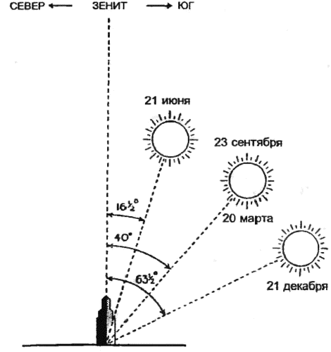 Например (мы по-прежнему считаем, что Земля вращается вертикально и Солнце светит точно над экватором), для человека, находящегося в Лос-Анджелесе иа северной широте 34°, полуденное Солнце появлялось бы на 34º южнее зенита. Для жителя Нью-Йорка, который находится на 6º севернее Лос-Анджелеса, полуденное Солнце появлялось бы на 40° южнее зенита. Для жителя Лондона, располагающегося еще дальше на север, оно было бы на 51º30' южнее зенита.