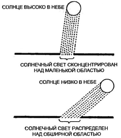 Сейчас представьте, что земная ось перпендикулярна линии, соединяющей Землю и Солнце: оно светит прямо на экватор. Человеку, живущему на экваторе, кажется, что Солнце каждый день всходит точно на востоке и садится точно на западе. Б полдень светило прямо над головой,