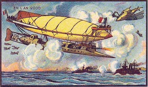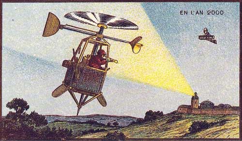 Учитывая, что Орвилл и Уилбер Райт совершили первый успешный полет на самолете в декабре 1903 года, эта иллюстрация самолетов с вращающимися пропеллерами в 1899 году может показаться пророческой, хотя это не совсем так. Поскольку планеры уже существовали, было естественно, что была предпринята попытка устранить их зависимость от воздушных потоков, оснастив их двигателем, приводящим в действие воздушный винт. (Хитрость заключалась в том, чтобы найти двигатель, который был бы одновременно и достаточно мощным, и достаточно легким). Еще в 1896 году американец Сэмюэл П. Лэнгли построил планер с электроприводом, который действительно летал, но не мог нести вес человека. Поэтому самолеты были вполне актуальны. Идея таких самолетов, перевозящих людей на короткие расстояния по городу, не может быть более человечной и приятной, так же как наиболее творческим является изображение самолетов, припаркованных на крыше станции аэротакси, с их крыльями, поднятыми вверх или развернутыми (как у бабочек). К сожалению, этот вид городского транспорта никогда не был принят и вряд ли будет принят даже в 2000 году. Хотя вертолеты иногда используются для поездок по городу, самолетам требуются взлетно-посадочные полосы, а их энергопотребление слишком велико, чтобы короткие полеты были экономичными.