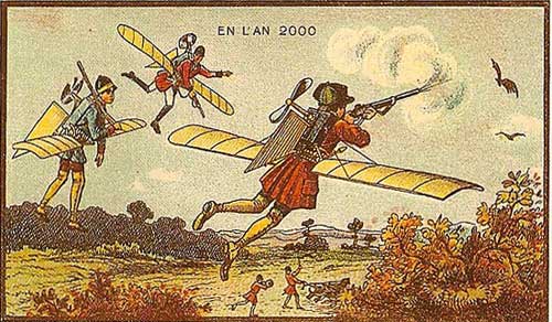 Гонки всех видов представляют собой очень распространенную человеческую деятельность. Пешие, автомобильные и конные гонки очень популярны, и неудивительно, что в 1899 году кто-то подумал, что в будущем будут проводиться воздушные гонки. На иллюстрации выше показана гонка, в которой участвуют не менее девяти небольших самолетов. У половины из них обычные крылья летучей мыши. У того, что расположен правее на заднем плане, изображены крылья, похожие на крылья стрекозы. Также появляется летающий человек благодаря определенному приспособлению, которое не может быть сильно устаревшим.