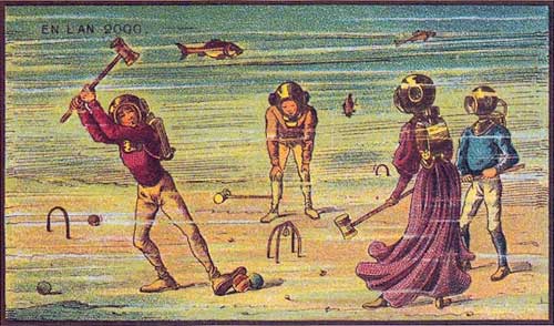 В настоящее время ходят слухи, что когда-нибудь появятся подводные отели, из которых гости смогут выходить для занятий водными видами спорта и водных прогулок, но они еще не построены, и нет никаких реальных планов, направленных на их строительство. Подводное развлечение, которым мы наслаждаемся сегодня – это плавание с использованием ластов, а не игра на морском дне, показанная на иллюстрации. На самом деле, представленная здесь партия в крокет довольно невообразима – если не считать шлемов, воздушных баллонов на спине и трех рыб, появляющихся на заднем плане, эта сцена вполне могла быть запечатлена на суше. И здесь люди также ходят в обычной уличной одежде. В этом случае длинное платье дамы должно быть промокшим, прилипшим и в последней степени стесняющим и неудобным. Также нет никаких признаков воздействия плотности или вязкости воды – под водой едва ли можно было бы танцевать с молотком, а деревянный шар всплыл бы, пока не достиг бы поверхности.