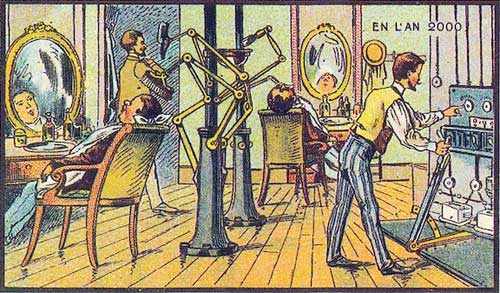 К 1899 году промышленная революция продолжалась уже целое столетие, и существующая техника выполняла все больше и больше задач, чем раньше приходилось решать людям и животным. Во второй половине XIX века в действие вступили такие электрические устройства, как телеграф, телефон, лампочка и фонограф. Казалось разумным предположить, что в этом направлении будет достигнут дальнейший прогресс и что к 2000 году многие виды деятельности в сфере обслуживания будут электрифицированы. Вот почему на приведенной выше иллюстрации изображен парикмахер 2000 года, использующий электрифицированные столбики, к которым подключены различные приборы. Пока одного мужчину бреют, другому расчесывают волосы. Что касается парикмахера, его задача-работать на ручках управления, настраивая рычаги и реостаты.