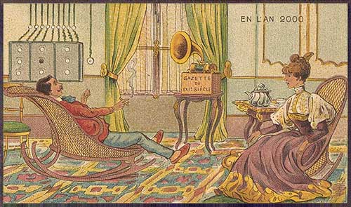 Здесь иллюстратор был очень хорош. В 1899 году, когда был сделан этот рисунок, Маркони экспериментировал с радиопередачей, но до 1901 года не удавалось отправлять радиосигналы через Атлантический океан. До 1906 года эти сигналы не удавалось преобразовать в звук, поэтому до тех пор никто не мог слышать музыку или слова по радио. И только в 1920 году удалось создать радиоприемник, достаточно простой в обращении, чтобы гарантировать его присутствие в обычном доме. На иллюстрации изображен радиоприемник, относящийся к началу 1920-х годов, и пара (одетая в стиле 1900-х годов), слушающая на нем новости. На радиоприемнике появляется надпись, которая гласит: «Gazette du XXI Siècle» («Газета XXI века»). Сложные приспособления, изображенные на стене, возможно, служат для управления радио. В 1930-х и 1940-х годах радио было основным методом получения самых последних новостей, и правительственные лидеры, такие как Франклин Рузвельт и Адольф Гитлер, использовали его для связи со своим народом и оказания на него влияния. Однако к тому времени звуковые системы радио уже достаточно продвинулись, чтобы сделать усилитель ненужным. Чего иллюстратор, конечно, не учел, так это того факта, что до середины века изображение будет преобразовано в звук, а радио превратится сначала в телевидение, а затем в цветное телевидение. Кроме того, спутники связи позволили бы телевидению охватить все части мира. К 2000 году в передачах, возможно, удастся показать даже трехмерные голографические изображения.