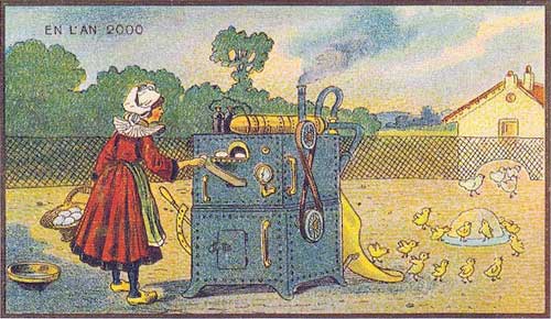 Земледелие и животноводство зародились более или менее в одно и то же время (даже в Библии Каин был земледельцем, а Авель-скотоводом). Однако механизировать животноводство сложнее, чем растениеводство. Здесь мы видим автоматизированный инкубатор. Молодая женщина, несущая корзину с только что отложенными яйцами, помещает их одно за другим в инкубатор, получающий тепло от сгорания топлива в цилиндре, находящимся на верхней части машины. (Обратите внимание на дым, выходящий из выхлопной трубы). Яйца медленно перемещаются внутри инкубатора, подвергаясь воздействию достаточного тепла. Есть циферблат, который, вероятно, показывает температуру в устройстве. Также имеются ручки, позволяющие открывать различные части машины для осмотра внутри. Есть два колеса, соединенных ремнем, которые вращаются с определенной целью. В конце концов яйца попадают в соответствующее место в машине, где цыплята вылупляются, и птенцы сползают на землю, где их ждет порция еды. Хотя можно подумать, что этот инкубатор ускоряет процесс инкубации, это не так. Насиживание длится двадцать один день, пока птенец не вылупится, и, возможно, никакие механические усовершенствования не смогут сократить этот период. На самом деле эта иллюстрация не представляет собой практически никакого предсказания. Первый инкубатор для цыплят был изобретен в 1843 году, за полвека до того, как был сделан этот рисунок.
