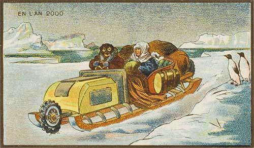 Однако время безмоторных путешествий подходило к концу, и иллюстратор точно это предвидел. Здесь он демонстрирует интересные моторные сани с вращающимся центральным передним колесом и боковым резервуаром для запаса топлива. (Все, кажется, указывает на то, что на другой стороне есть еще один бак). Ясно, что пассажиры саней находятся в начале своей экскурсии, потому что они находятся на берегу – за ними видна полоса открытого моря. Фактически, следующие люди, достигшие Южного полюса по суше, после Амундсена и Скотта, сделали это в 1958 году. Они продолжили марш и объехали весь континент. Это первое трансконтинентальное путешествие по суше было совершено, конечно, с помощью моторизованных транспортных средств.