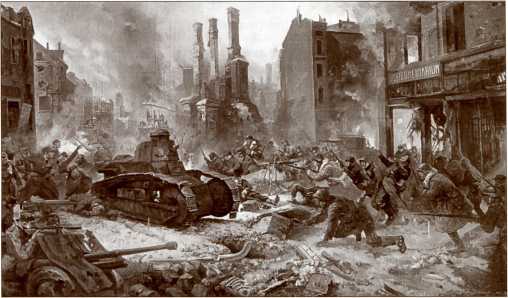 Создание легенды. Картина ленинградского художника А. Блинкова «Взятие Выборга советскими войсками 12 марта 1940 года». На картине бои идут в центре города, но в реальности в тот день части РККА стояли в 2 км южнее центра. До конца войны центр Выборга был в руках у финнов. На картине легко узнаются подбитый финский «Рено ФТ-17» и противотанковая пушка «Бофорс».