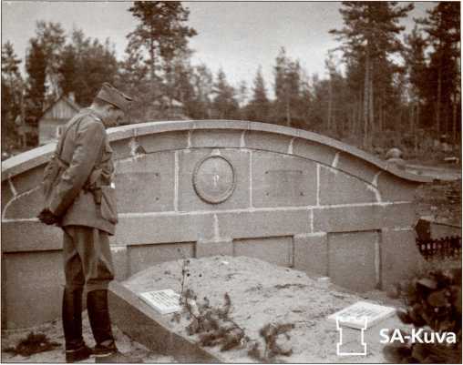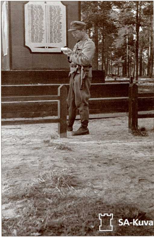Финский офицер у братской могилы танкистов 40-й легкотанковой бригады. Перкъярви (Кирилловское), лето 1941 года.