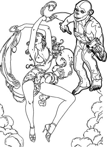 Это Паута заинтересовало. Незнакомка вызывала у него те же чувства, что и девушка в деревне. Он пожирал ее глазами, потом сосредоточился на грудях. Представил, как играет с ними электрохлыстом дзен-пушки, а ее тело извивается от боли. У него челюсть отвисла от возбуждения.
