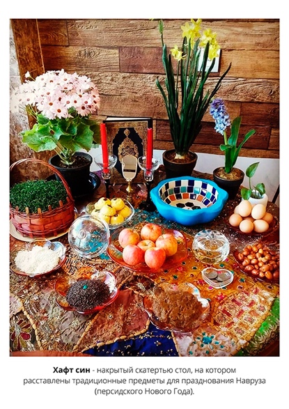 У нас на Новый год принято наряжать елку. Своя елка имеется и у персов – накрытый скатертью стол, на котором расставлены разные предметы. Называется он Хафт Син, или «семь синов».
