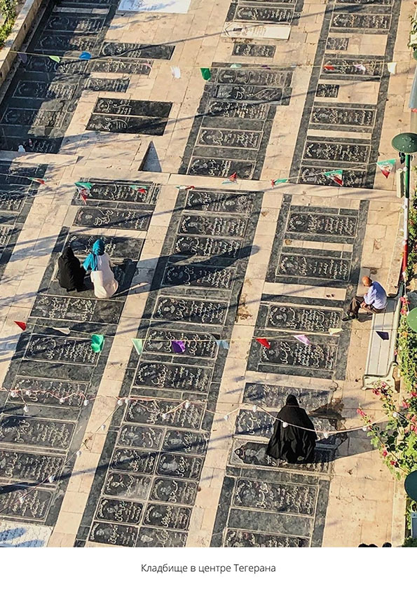 В четверг и пятницу немало людей приезжает на кладбища ухаживать за могилами. В отличие от крупных российских городов, где много церковных погостов и, соответственно, относительно много кладбищ в разных районах, в Иране (например, в столице) кладбищ в черте города мало. Основное кладбище Тегерана – Бехеште-Захра – располагается на окраине и по площади оно очень велико. Поскольку кремация в Иране не принята, участки должны быть достаточно большими, чтобы полностью захоронить тело. Тем не менее, возможны и «семейные», двух– или даже трехъярусные могилы, вырытые таким образом, чтобы у семьи оставалось еще 1-2 секции на будущее. Как принято у мусульман, тела хоронят без гроба и без одежды, только в саване, повернув на правый бок, лицом к Мекке. На иранских кладбищах нет оград, они представляют собой ряд плоских плит (вертикально стоящие надгробия встречаются редко, поскольку не поощряются религией). Богатые люди, впрочем, могут позволить себе приобрести целый фамильный склеп: помещение, внутри которого находится могильная плита.