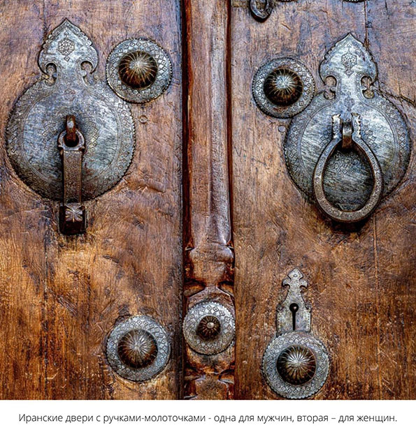 А еще в Иране есть очень простые, деревянные двери с ручками-молоточками. Таких ручек две: одна для мужчин, вторая – для женщин. Молоточки для мужчин – потяжелее и издают громкий, гулкий звук, а женские молоточки представляют собой полукруг, и звук от них тише. Так, по стуку в дверь, хозяева дома могли заранее узнать, кто к ним стучится: мужчина или женщина.