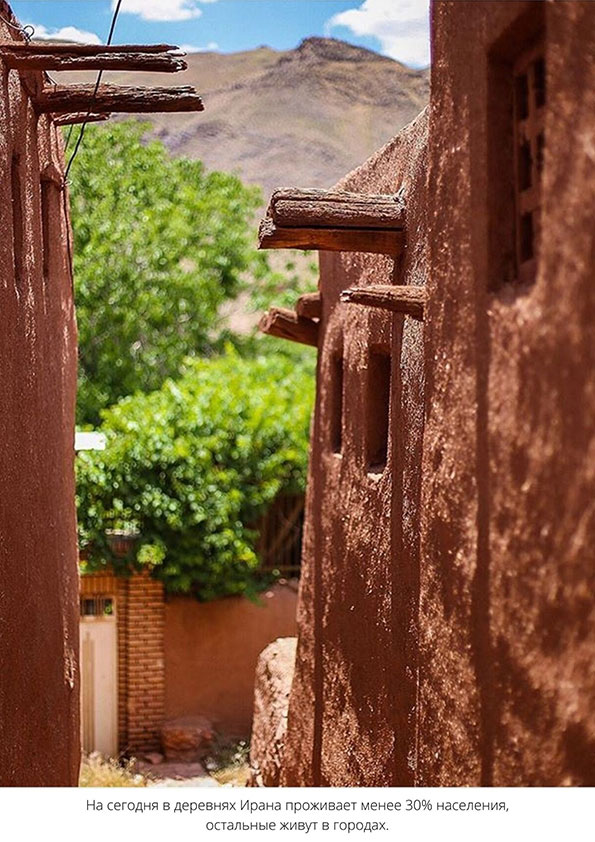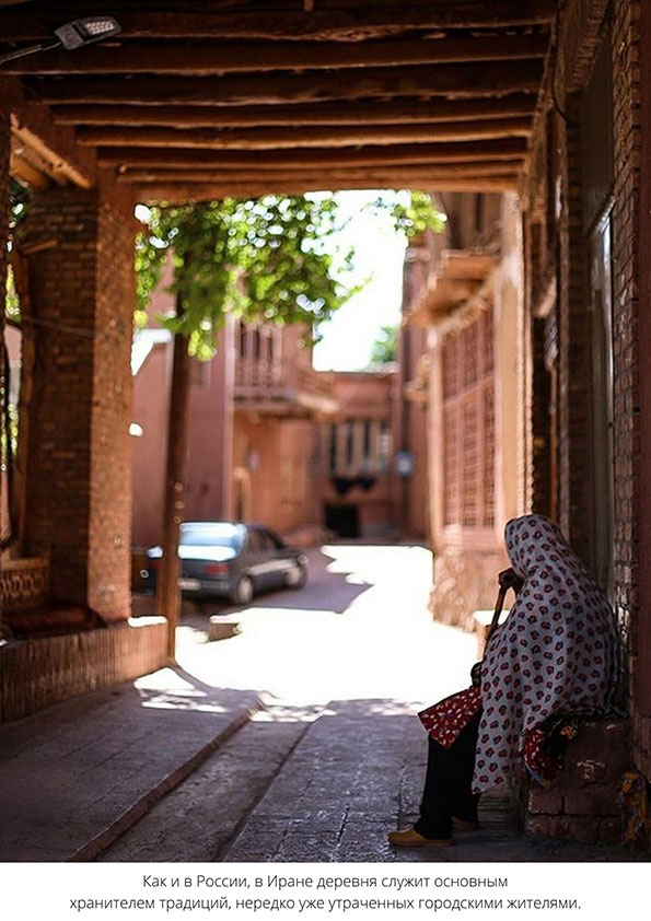 Как и в России, в Иране деревня служит основным хранителем традиций, нередко уже утраченных городскими жителями. И, как и другие страны, Иран не ушел от урбанизации: на сегодня в деревнях проживает менее 30% населения, остальные живут в городах. Старинный быт интересен, хотя, конечно, здесь отсутствует привычный комфорт – и даже сегодня крестьянам приходится много и тяжело трудиться.