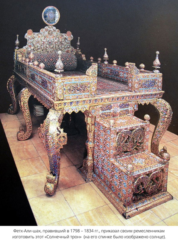Фетх-Али-шах, правивший в 1798 – 1834 гг., приказал своим ремесленникам изготовить этот «Солнечный трон» (на его спинке было изображено солнце). После того как шах женился на Тавус («Павлин») Таджодоле, трон переименовали в «Павлиний». Некоторые считают его знаменитым «Павлиньим троном», привезенным из Индии, но это не так.