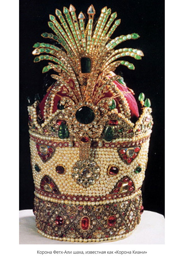 Корона Фетх-Али шаха, известная как «Корона Киани» украшена бриллиантами, изумрудами, рубинам и жемчугом. Основный красный камень – корунд Аурангзиб. Корону изготовили во времена правления Фетх-Али шаха, в 1797 г., и ею пользовались несколько шахов после него. Она стала первой короной, изготовленной в Иране после падения Сасанидов под натиском арабов-мусульман.