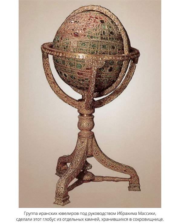 Работу над глобусом из драгоценностей начали в 1869 г., по приказу Насер ад-Дин шаха. Группа иранских ювелиров под руководством Ибрахима Массихи, сделали этот глобус из отдельных камней, хранившихся в сокровищнице. Чистый вес золота, использованного при изготовлении глобуса, составляет 34 кг, а драгоценные камни все вместе весят 3 656 г. Как об этом часто упоминают, ювелиры куда лучше разбирались в работе с драгоценностями, нежели в географии, поэтому отдельные страны определить на глобусе достаточно сложно. Моря и океаны выложены из изумрудов, материки – из рубинов. Юго-восточная Азия, Иран, Англия и Франция представлены бриллиантами. Диаметр глобуса составляет около 66 см. Опора изготовлена из дерева, инкрустированного драгоценными камнями.