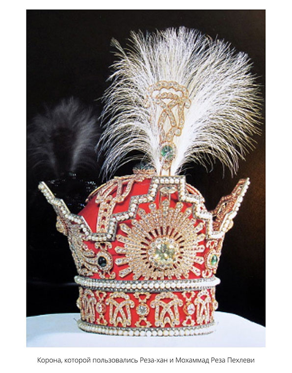 Корона, включающая 3 380 бриллиантов (1 144 карата) и 368 жемчужин (весит все вместе 2 080 г) использовалась во время коронации Резы-хана Пехлеви 25 апреля 1926 г. и Мохаммада Резы Пехлеви 26 октября 1967 г.