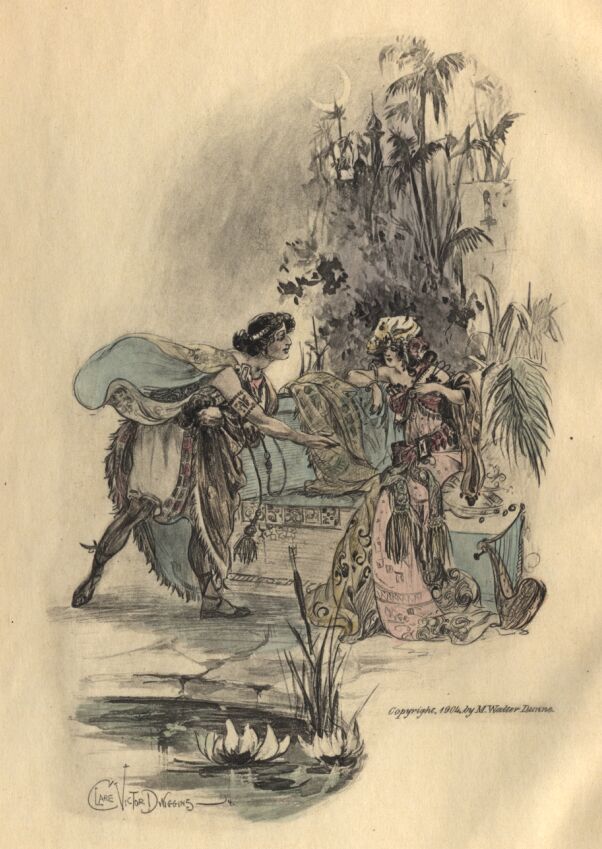 Человек освободил золотой засов, прошел сквозь галерею, вступил в роскошный зал, отделанный белым и зеленым мрамором, уселся на кушетку возле порфирной чаши фонтана. Двери зала отворены в сад. Послышался шепот, ясно прозвучало: «Хонайн». Из сада навстречу гостю шла женщина, длинная вуаль покрывала лицо ее и плечи.