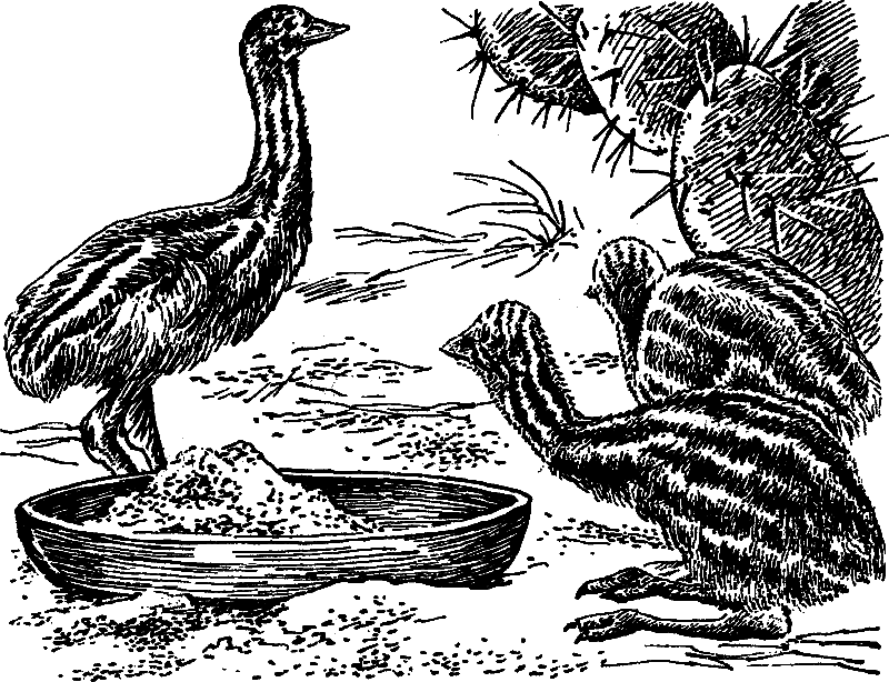 В Кенигсбергский зоопарк одного самца эму привезли в 1897 году; в 1928 году он всё ещё был жив, следовательно, прожил тридцать два года в неволе. Кстати, его «супруга» про– жила в зоопарке двадцать шесть лет. 1ак вот, этот самец во время насиживания ничего не ел и не пил и вообще вставал с гнезда чрезвычайно редко. Пока страус сидел на кладке, он разрешал забирать из гнезда яйца и вылупившихся птенцов, однако когда он уже водил свой выводок по вольере, то подходить к нему не рекомендовалось: он становился крайне агрессивным.