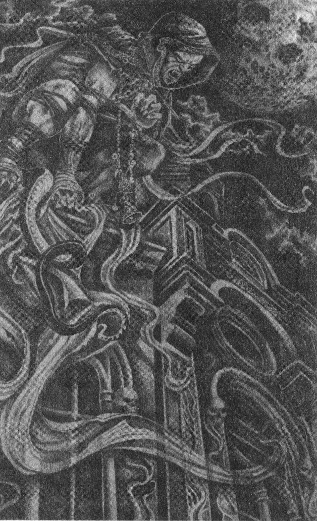 От этого восприятия был сделан небольшой шаг к представлению о том, что злобных мертвых могли поднимать из могил или контролировать черные маги. Этой властью, как считалось, обладали могущественные колдуны, некоторые из них, возможно, были служителями церкви! Одним из наиболее известных колдунов был епископ Готтскелк, Зло Холара (1497–1520), который, как сообщается, составил страшную колдовскую книгу – «Раудескайн» («Обтянутая красной кожей»), состоящую из многочисленных заклинаний для поднятия мертвых и направления их против живых. Многие из таких волшебников участвовали в создании магической «шестерки» (хотя не совсем ясно, была ли она вырезана из дерева или просто была руническим рисунком). Самым знаменитым и самым мощным из этой «шестерки» был Эйшджелмур («шлем, внушающий страх»), который мог превратить недавно захороненные трупы в драугров, нападающих на живых, пьющих их кровь и пожирающих их плоть. Эти оживленные тела, как сообщала древняя мудрость, заключали в себе демонов, которых волшебник вызывал из самой Преисподней.