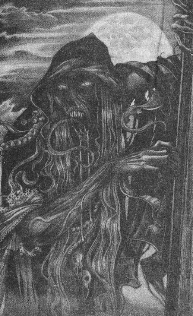 В течение следующих двух месяцев многие люди в деревне начали болеть и умирать, а Гуареч-и-Рхибин видели несколько раз на старом кладбище Ллин-и-Гуэлан-Гох. В конце концов делегация местных (включая саму Энн Хагес) пошла к благочестивому Элиасу Пугу и спросила его, может ли он что-либо сделать. Праведный человек выслушал их опасения очень серьезно. Он знал, что на кладбище было захоронено несколько людей сомнительной репутации, и предположил, что это могло привлечь сюда существо. Если карга Дриббл уже обосновалась в обществе, то ее трудно было прогнать. Он сказал, что единственным способом сделать это было применение физической силы, существо нужно будет изгнать. Вооружившись прочной палкой, священник отправился на кладбище. Луна была полной, и, когда он достиг разрушившейся стены, окружавшей захоронения, ему показалось, что он мельком увидел огонек, покачивающийся и движущийся во мраке позади нее. Когда он подошел ближе, он подумал, что увидел на другой стороне притаившуюся фигуру в зеленом платье, от которой исходил слабый мерцающий свет – свечение из-за гниения. Он очень крепко сжал палку, которую нес, и пошел вперед. Он достиг стены, и вдруг фигура, движущаяся по кладбищу, стала превращаться в светящийся шар, становясь все больше и больше, и кинулась к нему. Когда шар достиг его, казалось, он снова приобретает более твердую форму, бросив его на землю. Он ударил палкой и почувствовал, что она попала во что-то твердое. Послышался гулкий звук, как если бы он ударил по пустому барабану, и существо отлетело. Но неожиданно оно снова оказалось на нем. Взглянув вверх, он увидел сальное и грязное покрывало на голове, а под ним почти плотную черноту. У существа не было лица! А еще на зеленом одеянии, обернутом вокруг худого тела, были кусочки чего-то, что казалось высохшей кровью. В это мгновение он понял, что это действительно Гуареч-и-Рхибин.