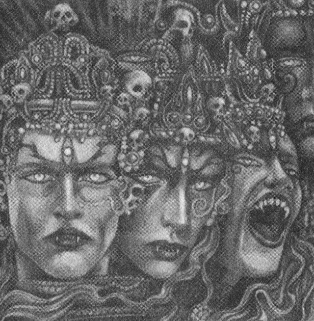 Некоторые поверья, еще больше запутывающие дело, утверждали, что вампиры – это вовсе не ожившие трупы, они происходят от живых существ, обычно могущественных и злых колдунов и ведьм. В действительности в некоторых регионах страны слово ракшаса просто означает «колдун», многие из которых были связаны с животными или духами животных, чаще сов и тигров. Такие волшебники могли действовать на расстоянии, легко высасывая здоровье и жизненные силы у своих жертв, даже если они не были поблизости от них. И, как уже упоминалось, некоторые ракшасы передвигались невидимыми и могли овладеть людьми за столом или когда они спали. Это вид демонов, полностью противостоящий всему человеческому, они никогда не были живыми.