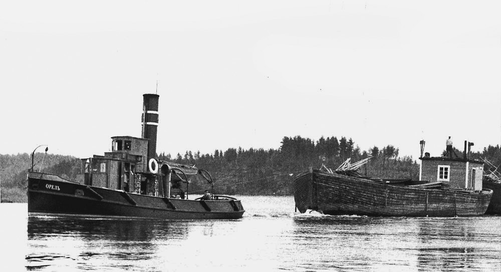 Паровой буксирчик тянет баржу