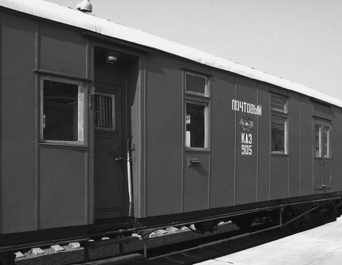 Из почтового вагона, прицепленного сразу за паровозом, высовывался человек в синей куртке.