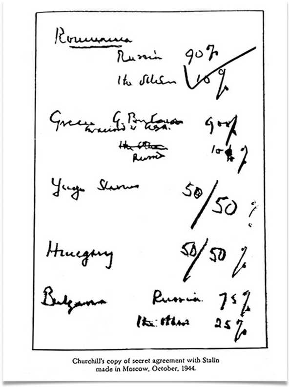 В октябре 1944 года, когда Черчилль снова прибыл в Москву, он набросал на листке бумаги свои предложения. Болгария станет советской на 75 %, Греция на 10 %, Венгрия на 50 %, Румыния на 90 %, Югославия – пополам.