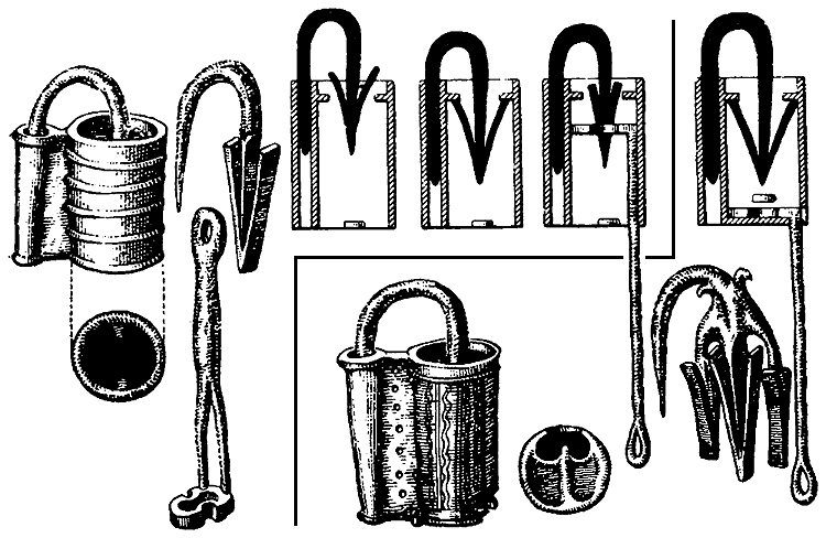 Трубчатые замки по области их массового распространения можно назвать замками киевского типа. Этот тип, представленный сотнями экземпляров стандартных, одинаковых замков, выработался не сразу. В русских древностях IX–XI вв. встречаются замки, основанные на том же пружинном принципе (без поворота ключа), но совершенно иной формы. Корпус замка – кубический или трапецевидный, размеры сильно варьируют[481]481