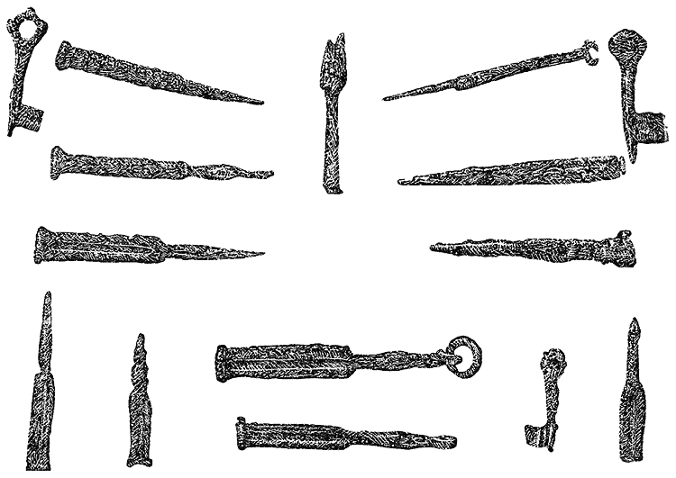 Кузнечные инструменты очень небольших размеров и пригодны только для тонких и деликатных работ. Назначение коленчатого железного стержня неизвестно. Наличие тесла говорит о том, что мастеру-кузнецу приходилось иметь дело с обработкой дерева (для рукоятей?).