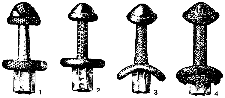 Рис. 44. Рукояти русских мечей.