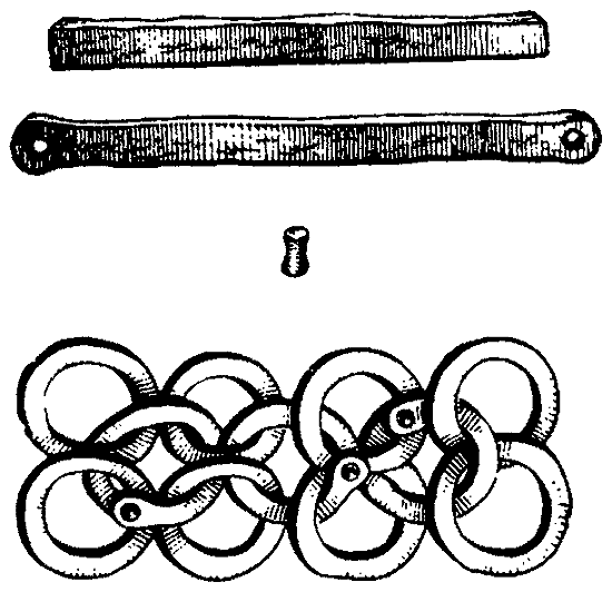 Средняя часть колец имеет округлое поперечное сечение, а концы их откованы на четыре грани. Каждое кольцо несколько разогнуто в сторону таким образом, что плоскость одного конца находится под прямым углом к другому. В случае надобности такой разворот допускал обработку каждого конца колечка. Думаю, что мастер, погребенный в кургане № 50, занимался изготовлением кольчуг. Обряд трупосожжения оставил нам, вероятно, не весь инструментарий. Так, недостает наковаленки, молотка и пинцета, но они могли быть и не положены в могилу. Техника изготовления кольчуг такова (рис. 46): выковывалась железная проволока, от которой отсекались куски около 3 см длины.