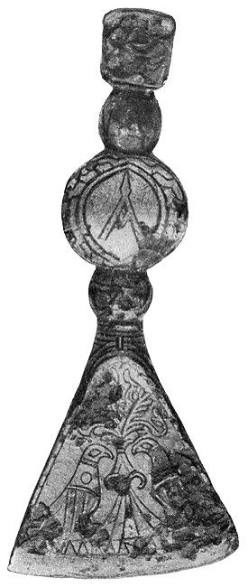 Рис. 45. Рукоять меча, обложенного серебряной пластинкой, украшенной гравировкой и позолотой. Киев.