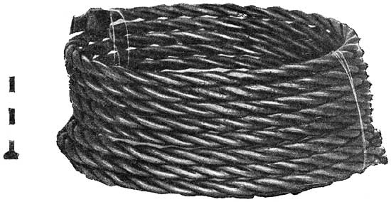 В Киеве была найдена интересная заготовка медного проволочного жгута для гривен. Мастер заранее сделал толстую проволоку, свил ее в жгут, а затем закрутил в несколько рядов. По мере надобности от заготовки отрезался кусок и из него делалась гривна. Найденный жгут рассчитан на 8-10 гривен (рис. 86)[670]670